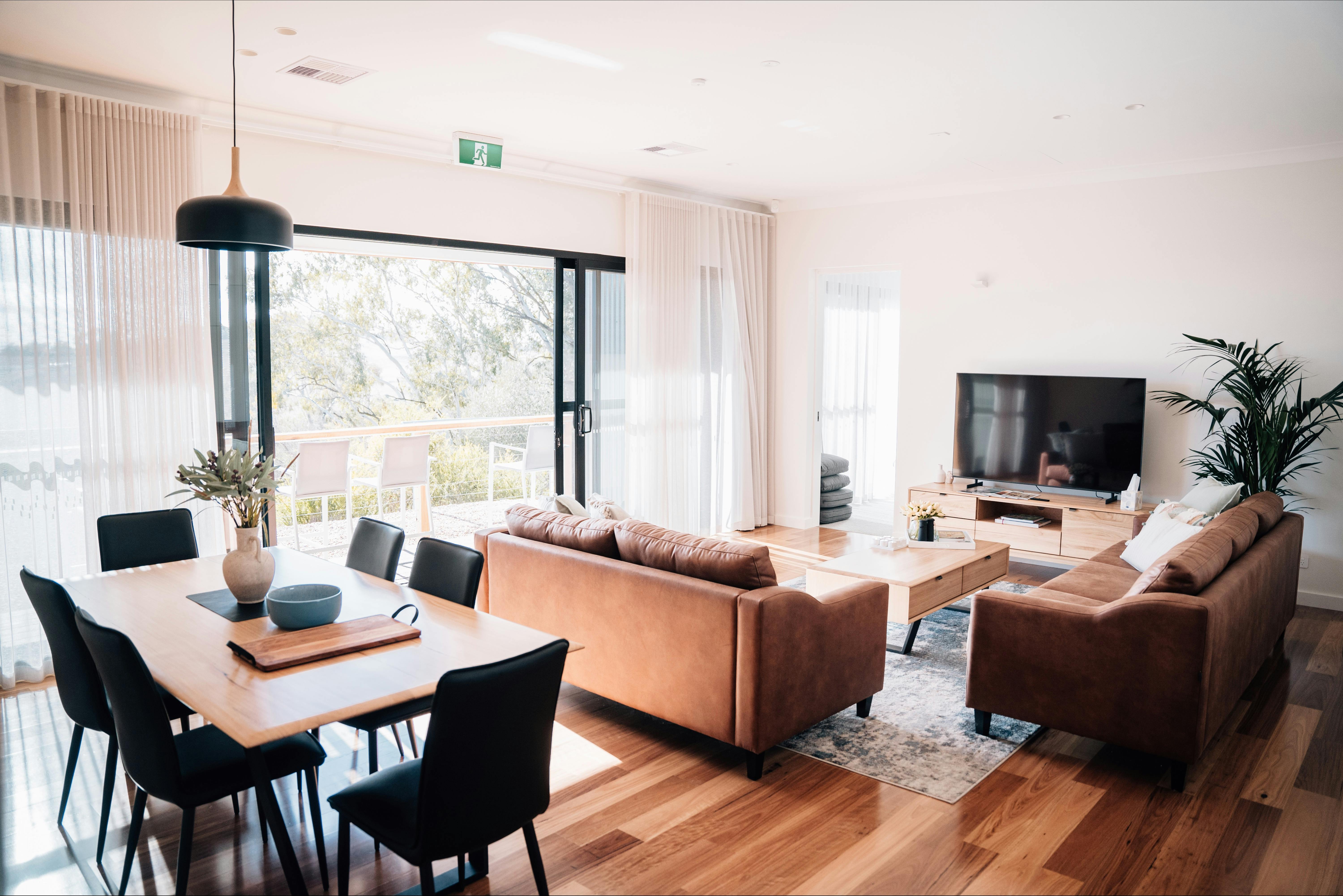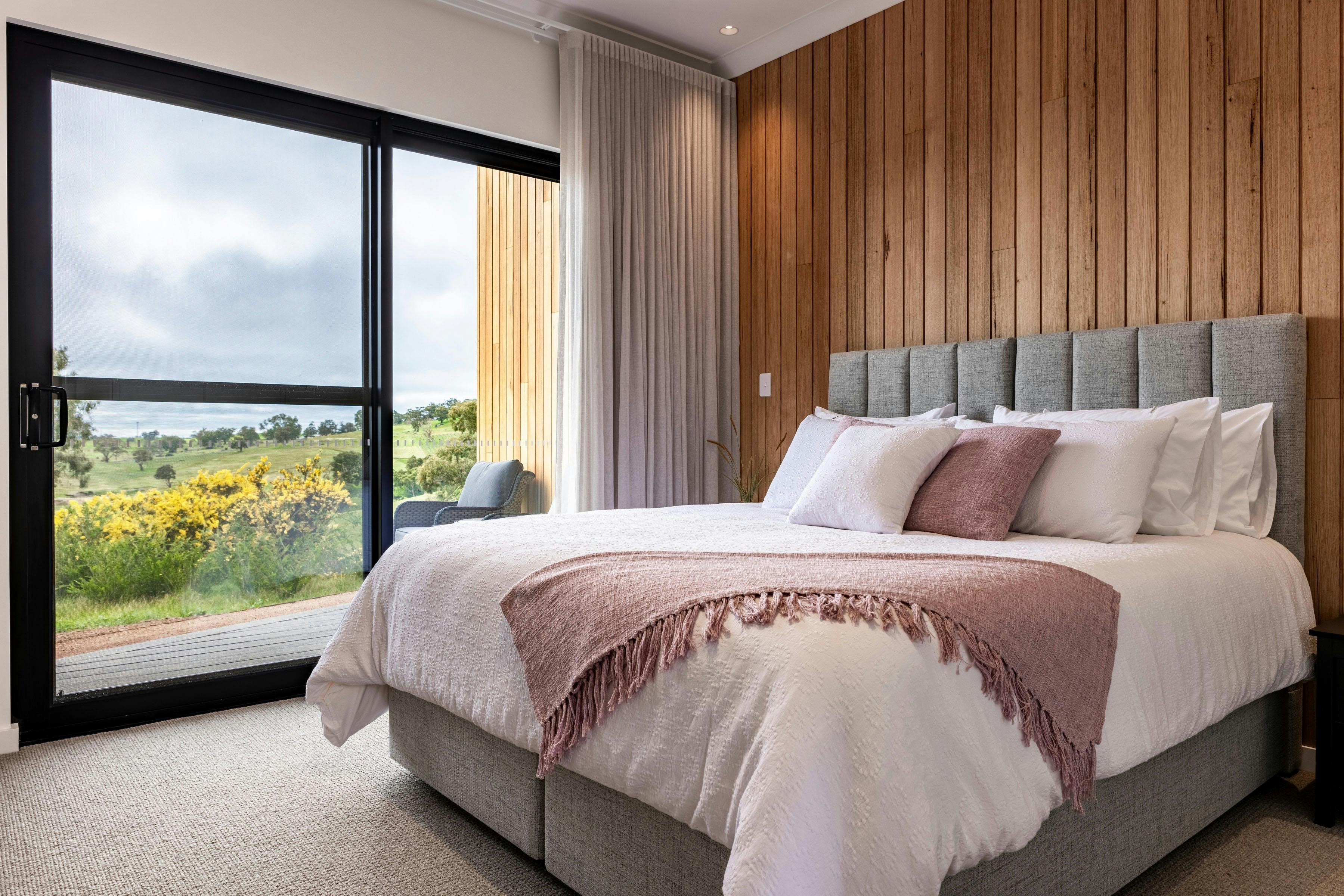 Each pavilion features three beautifully appointed suites, each with its own ensuite and private deck, ensuring space and serenity for every guest. Pavilion 2 has been mindfully designed to include an accessible ensuite. The open-plan living area includes a stunning gourmet kitchen with premium European appliances and a spacious butler’s pantry, perfect for preparing local produce and sharing meals together. Guests can unwind in the private wine lounge or entertain outdoors in the alfresco kitchen and dining area, complete with fire pit and panoramic vineyard views—ideal for evenings under the stars.
