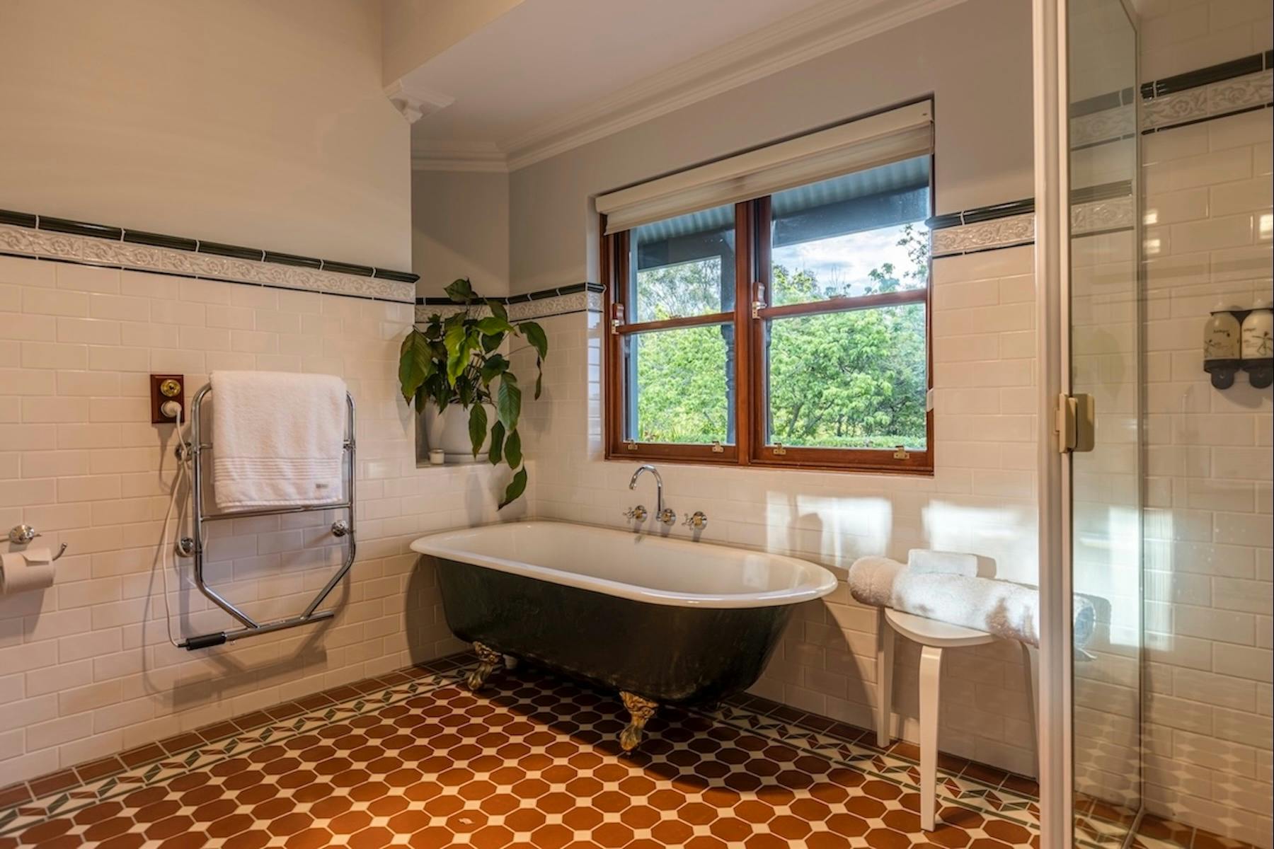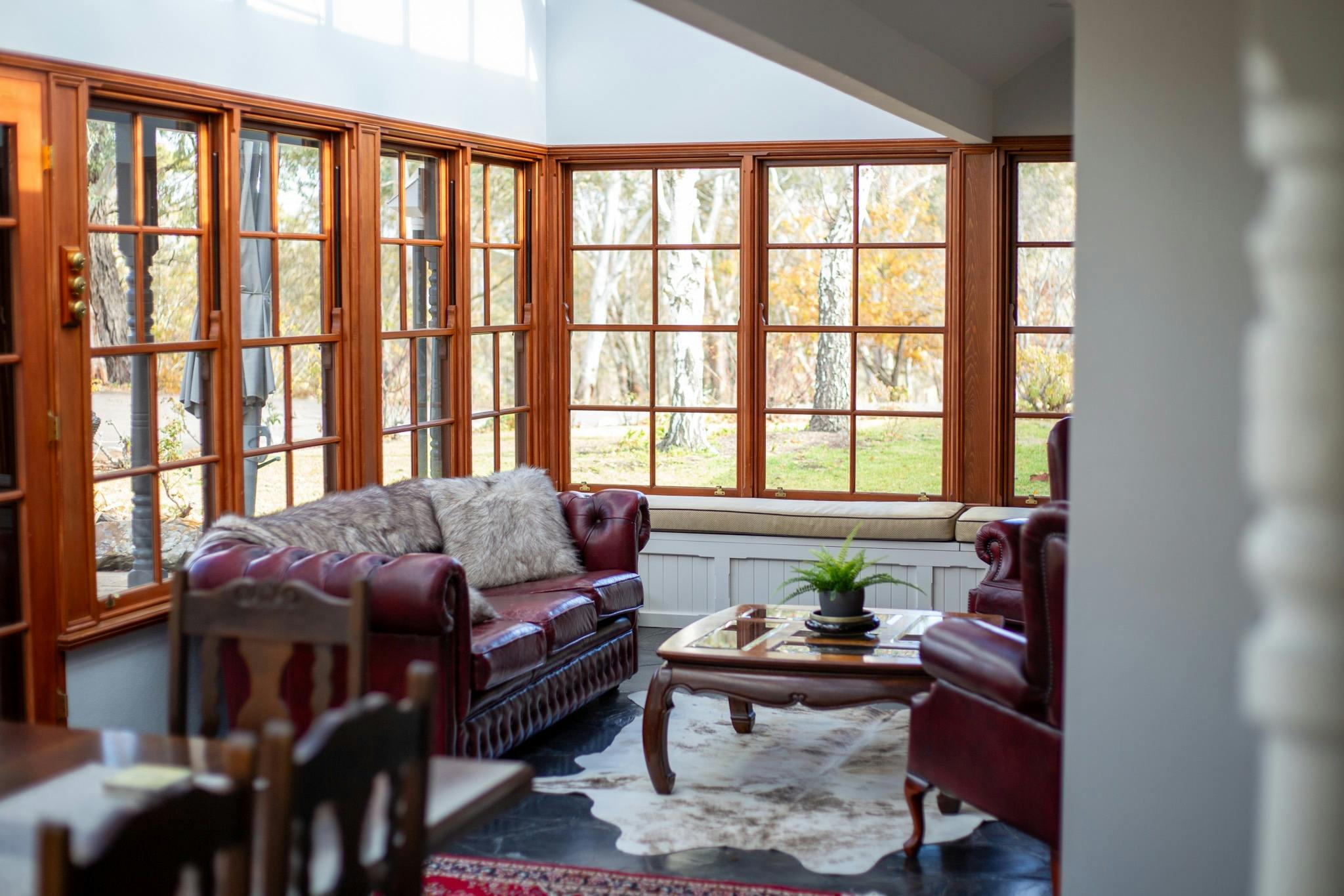 Every feature of Benbullen Homestead has been designed to inspire relaxation and togetherness. The master suite, known as the Bridal Suite, includes a king bed, walk-in robe, claw-foot bath and sweeping valley views. Additional bedrooms open onto the wraparound veranda, while the guest suite provides private ensuite comfort. The gourmet Hamptons-style kitchen, with marble benches, Italian double stove, gas cooktop and butler’s pantry, is ideal for preparing shared meals. Multiple living areas—a formal lounge with fireplace, sunlit atrium, library with piano and games room—offer spaces to gather or unwind in quiet seclusion.