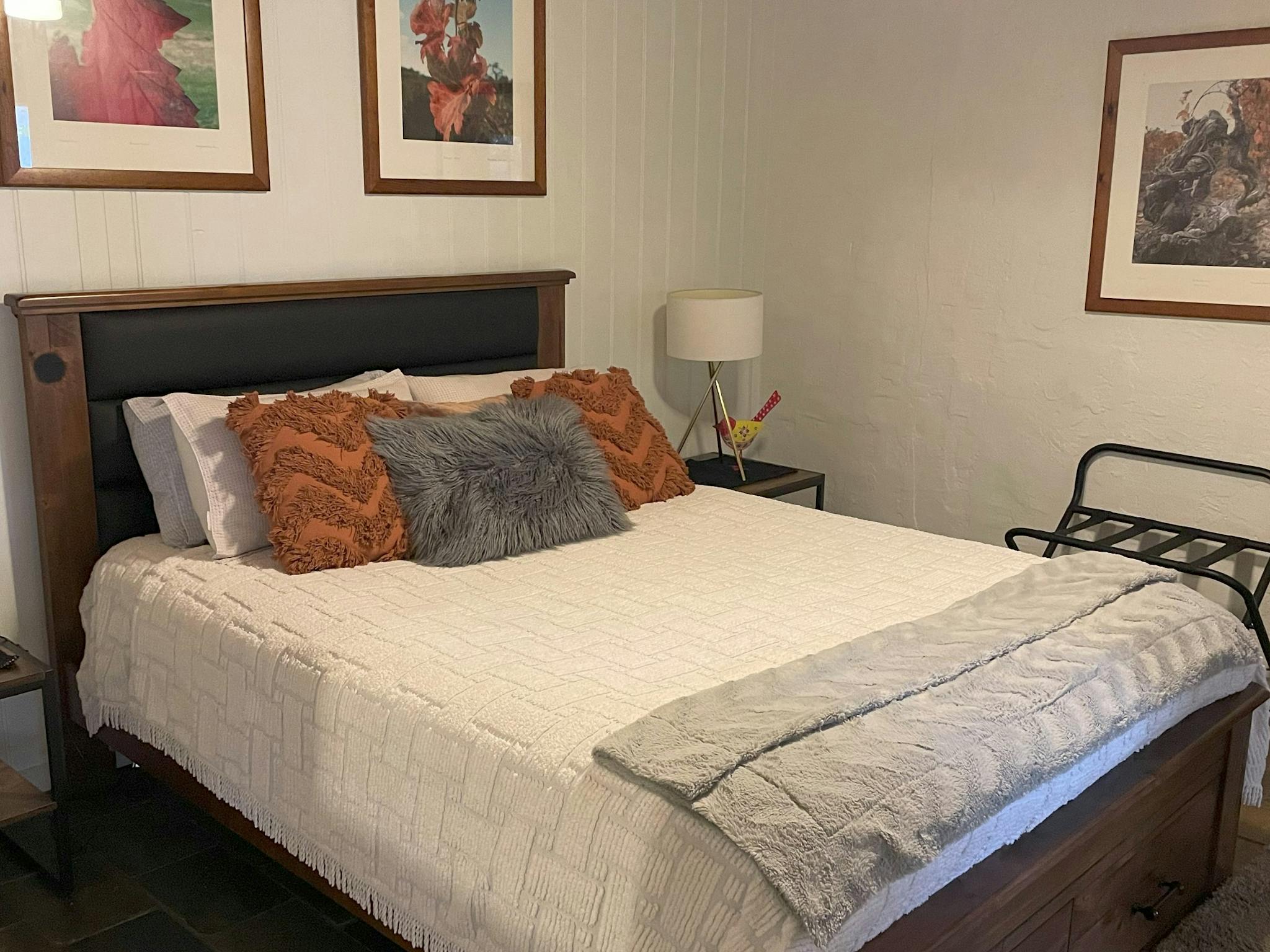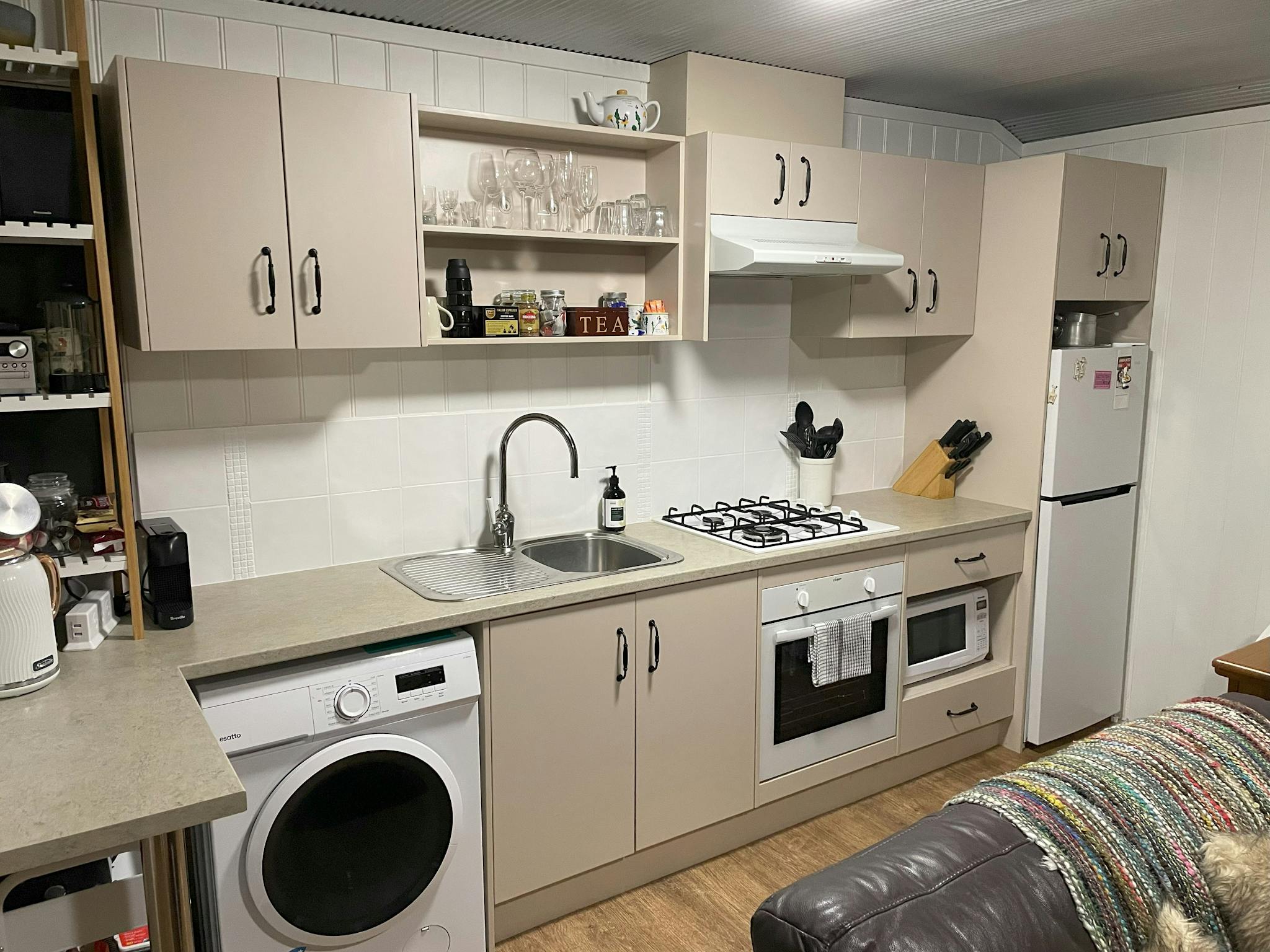 Tucked away at the rear of a half acre block, it’s close to everything, with a semi-rural feel. It’s built for two with a cosy bedroom, open plan living area and fully equipped kitchenette. Guests have their own entry and a private garden with barbecue area. The garden is fully fenced. Undercover off-street parking is provided. Ideal for short or long term stays it offers rustic charm with modern comforts.