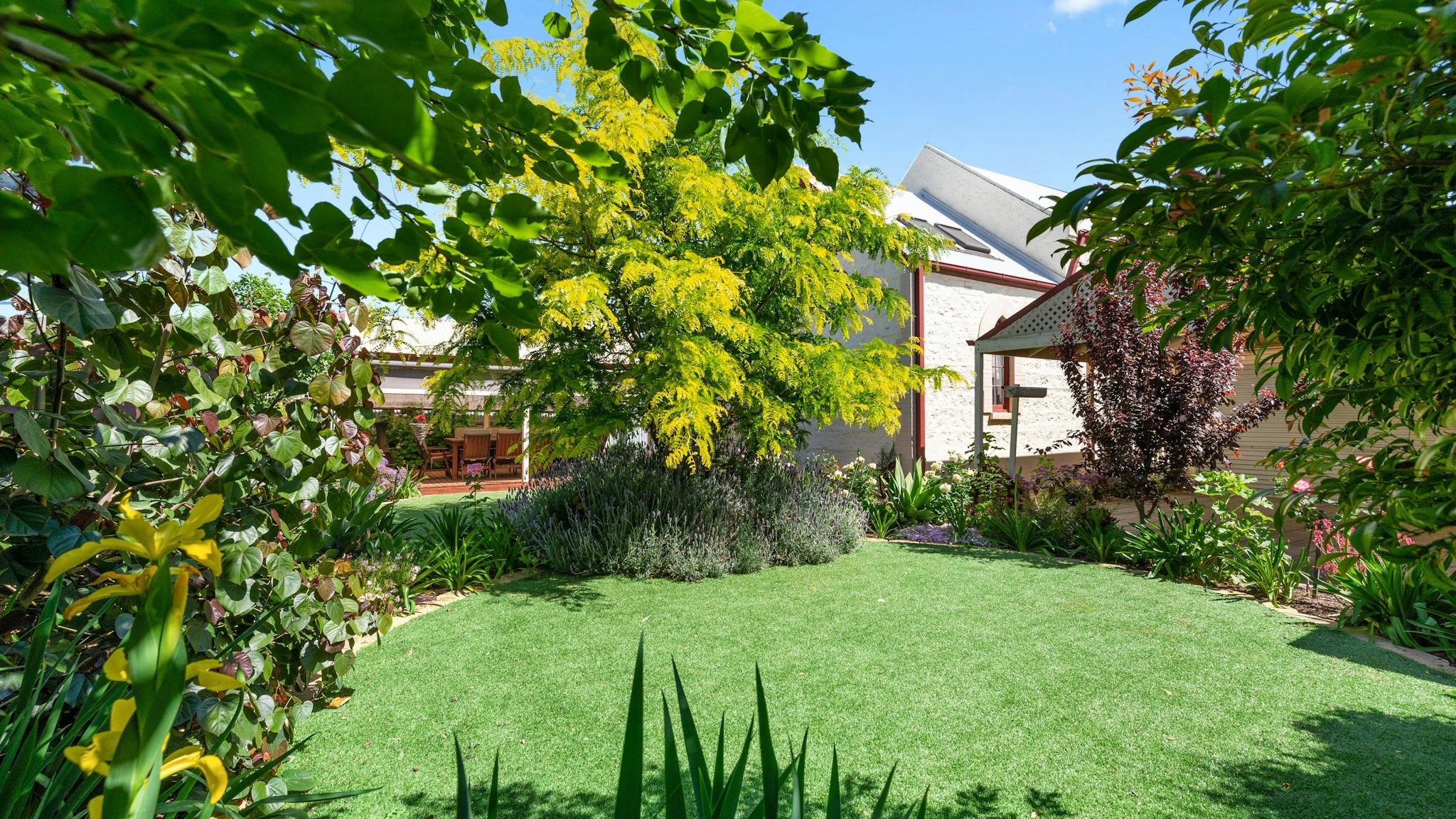 Outside, there is a decked pergola with a barbecue and garden backdrop, a side produce patio and a secure, double carport for guest vehicles, with additional onsite parking in the driveway.