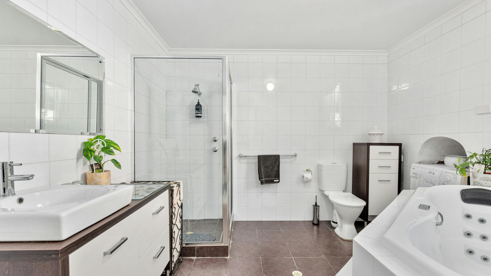 Inside, the home provides three bedrooms—one queen-size downstairs adjacent to the main spa bathroom and a queen-size and double-size bedroom upstairs with a second bathroom. There is an open-plan lounge, dining, and kitchen area downstairs, with a smaller living and dining space also on the second level.
